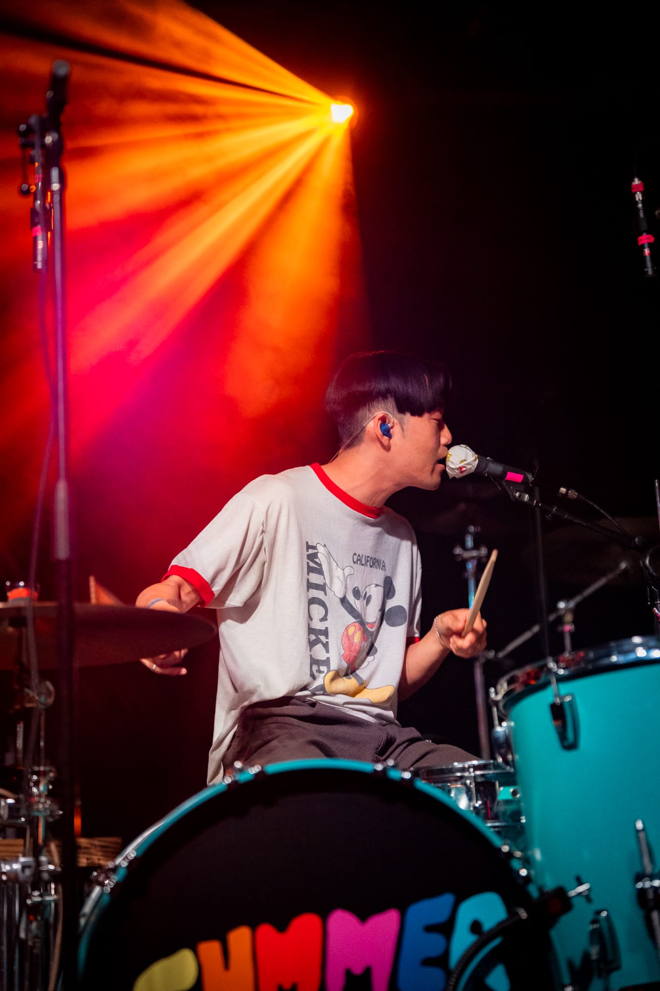 Keeping the energy rolling the entire night was Sam Kless, who somehow seemed to be playing bass and waving his arms side to side and leading the audience in clapping along simultaneously as if there were three of him and each one had an extra hand somehow. Bouncing all over the stage and acting like he loves Mom Jeans songs every bit as much as the audience, it's almost like he took it as his personal mission to not allow the energy in the room to fall below a 9 for their entire set. Guitarist Bart Thompson, sporting a Cubs t-shirt old enough that he had to have picked it up at a thrift shop that day, charmed the crowd on stage right the entire time all while drummer Austin Carango kept the entire cacophony from going off the rails, pushing each of their songs forward with momentum that ebbed and flowed throughout the night depending on the mood of each song.