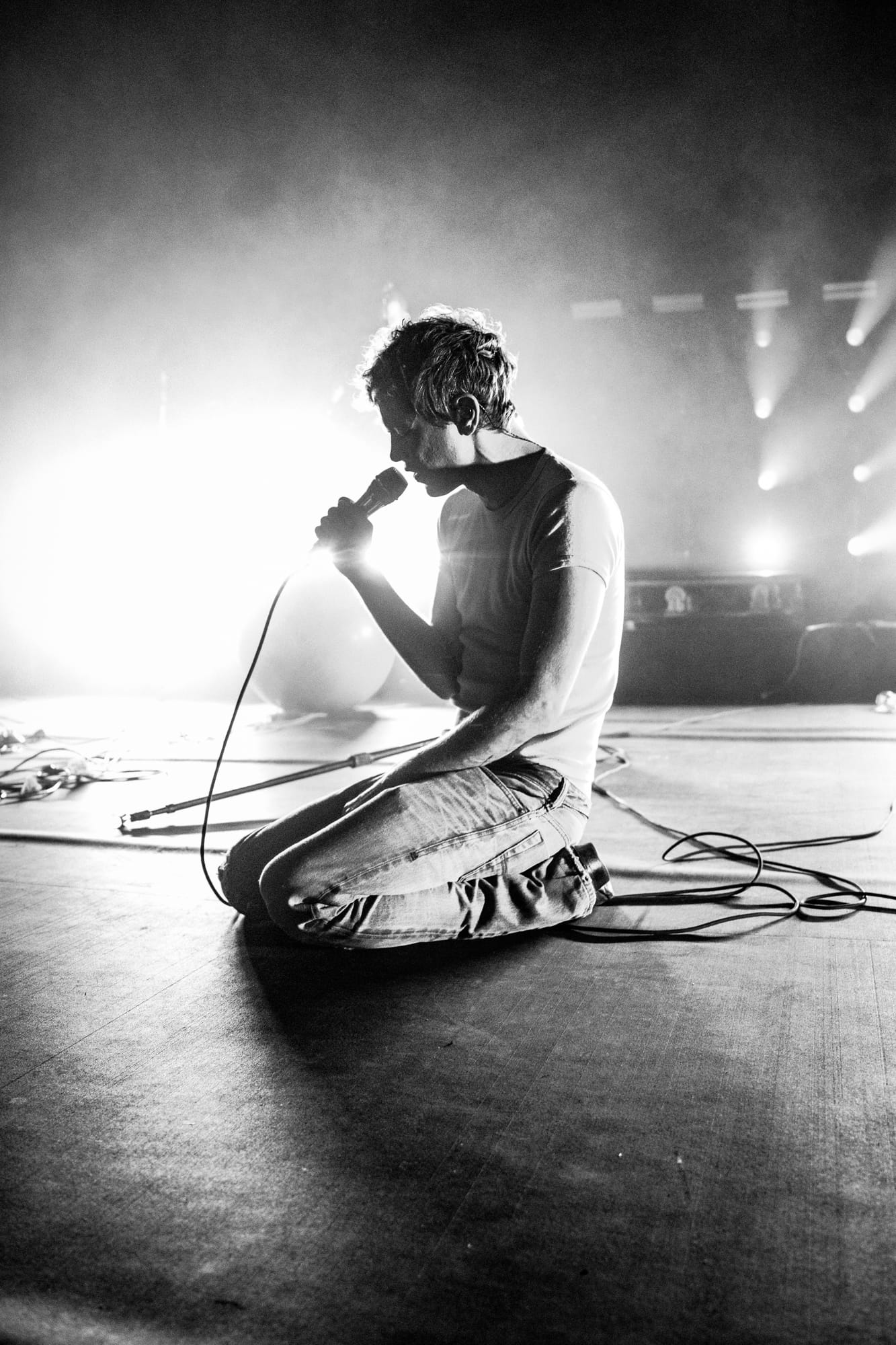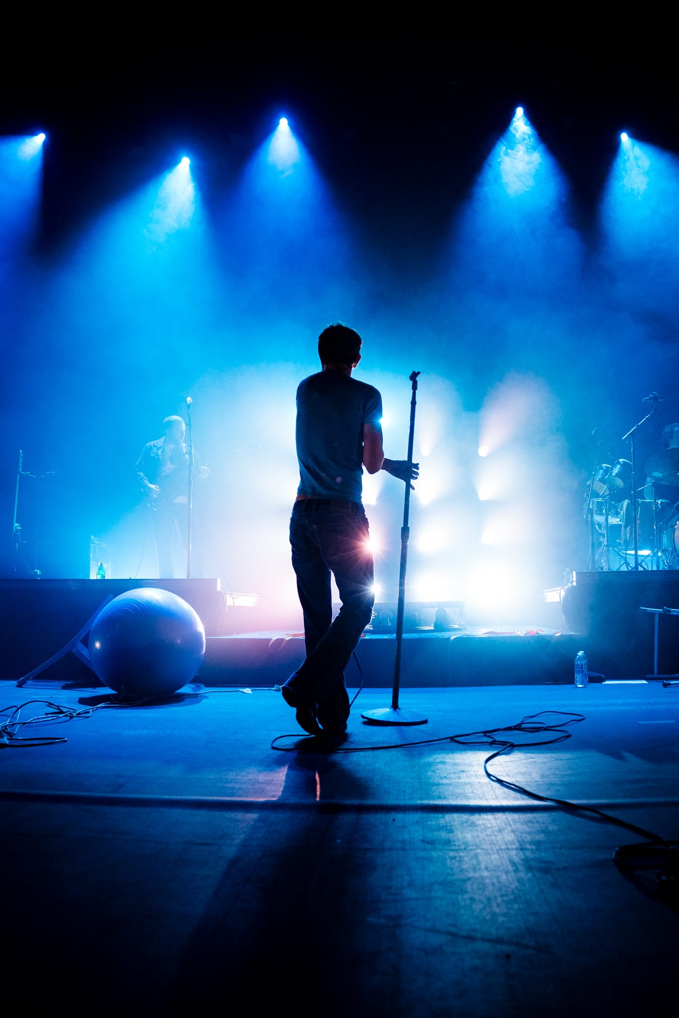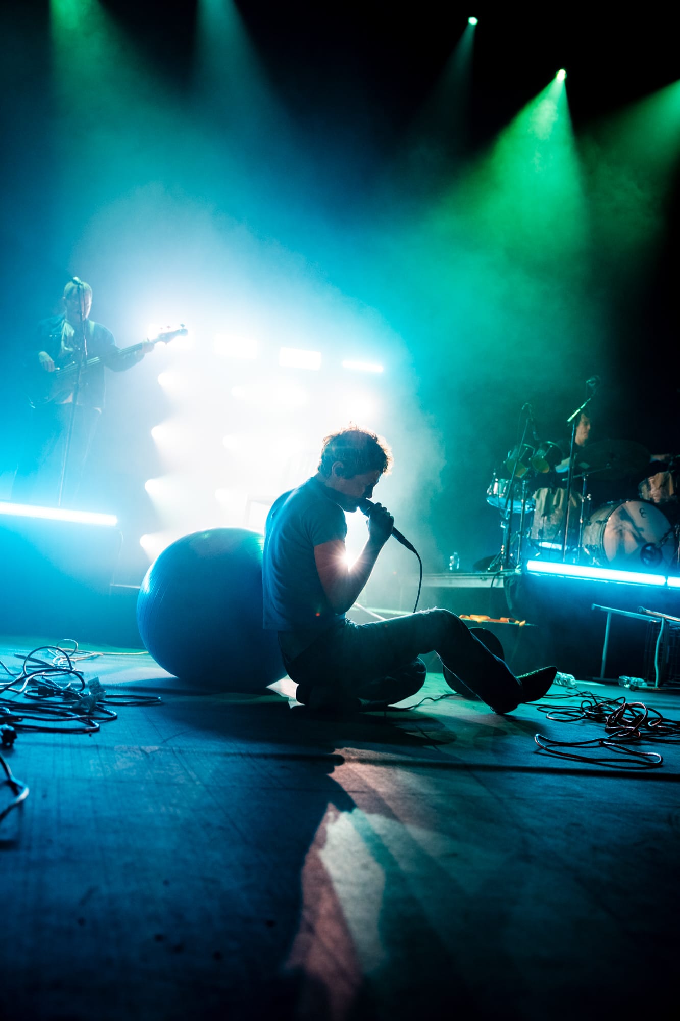 When I mentioned Hadreas putting on a 'performance' earlier, I meant it. And yes, I know that technically every concert is a performance by definition, but Perfume Genius shows are truly a performance. Following 'In A Row' with two more Glory tracks ('It's a Mirror' and 'No Front Teeth'), Hadreas sprang into action. With the deliberateness and occasional sloppiness that are hallmarks of improvisation, he interacted with everything onstage as he sang each song in his trademark sound that is somehow both barely above a whisper yet holds the weight of the world. He'd check on his bandmates, occasionally sit on (and slip off of ) the exercise ball, and writhe his body around the stage floor until it looked like he'd never be able to get untangled from the extension cords.