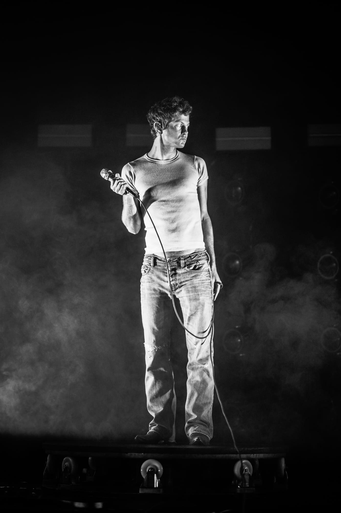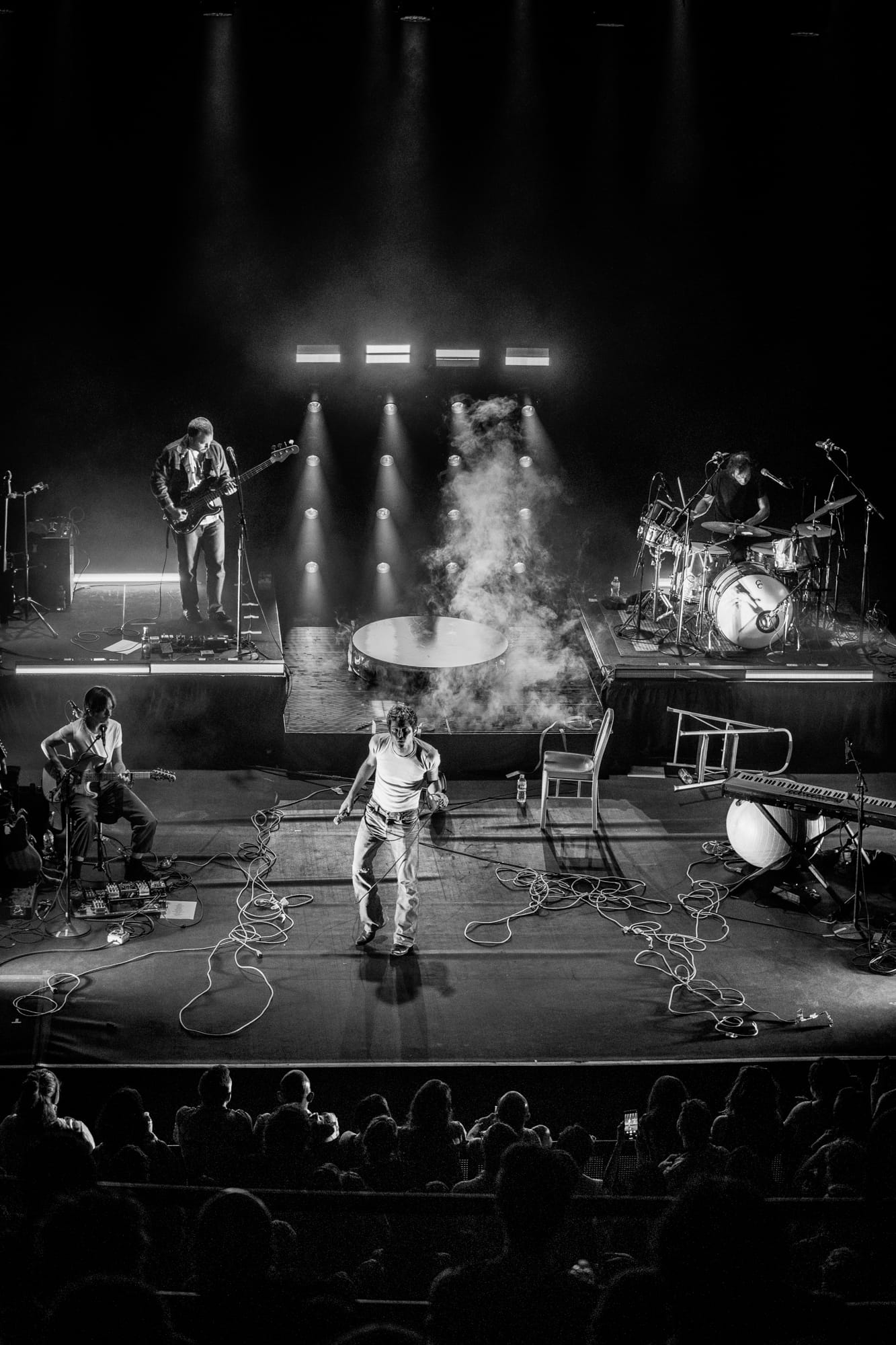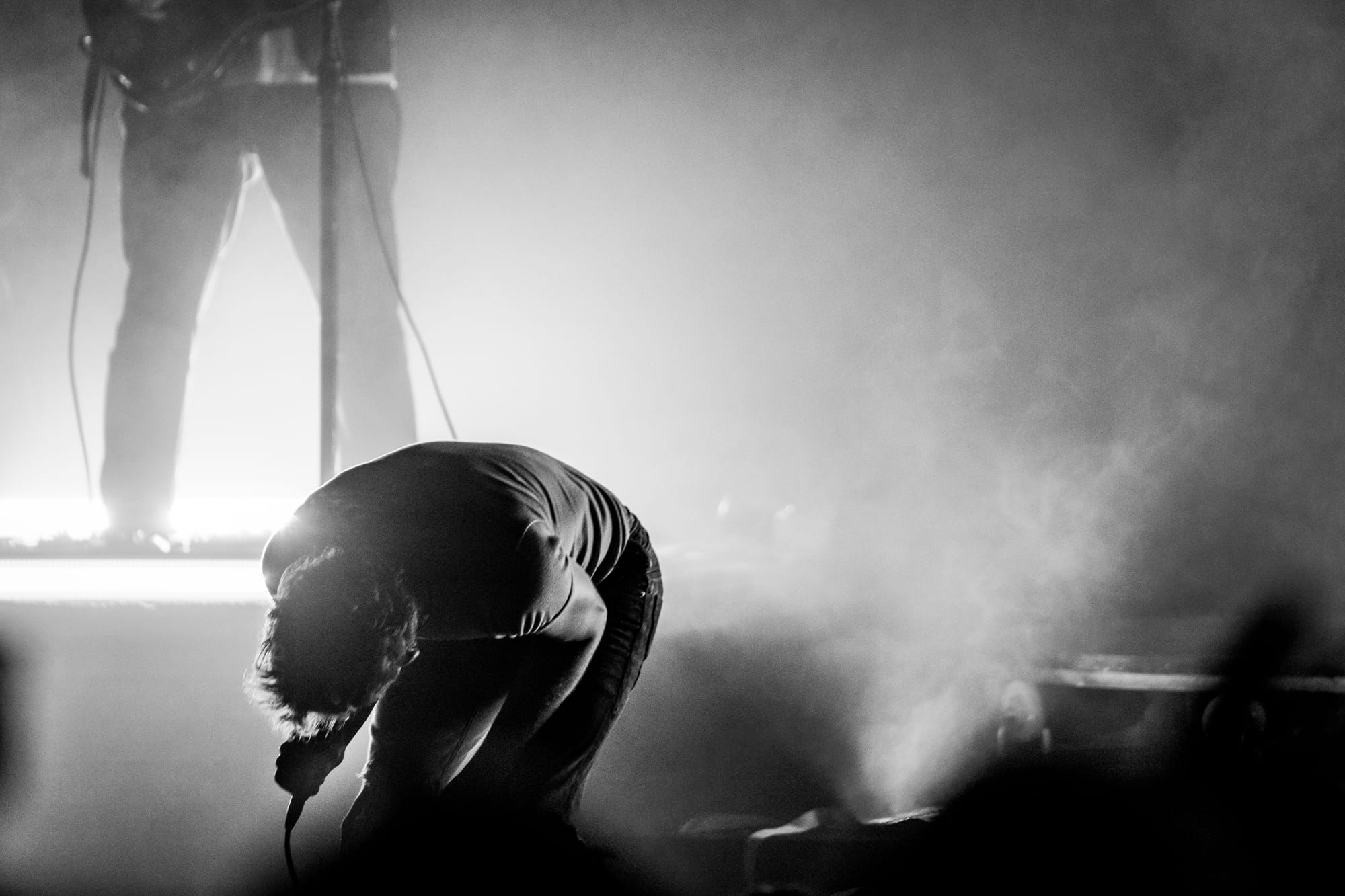 When I mentioned Hadreas putting on a 'performance' earlier, I meant it. And yes, I know that technically every concert is a performance by definition, but Perfume Genius shows are truly a performance. Following 'In A Row' with two more Glory tracks ('It's a Mirror' and 'No Front Teeth'), Hadreas sprang into action. With the deliberateness and occasional sloppiness that are hallmarks of improvisation, he interacted with everything onstage as he sang each song in his trademark sound that is somehow both barely above a whisper yet holds the weight of the world. He'd check on his bandmates, occasionally sit on (and slip off of ) the exercise ball, and writhe his body around the stage floor until it looked like he'd never be able to get untangled from the extension cords.