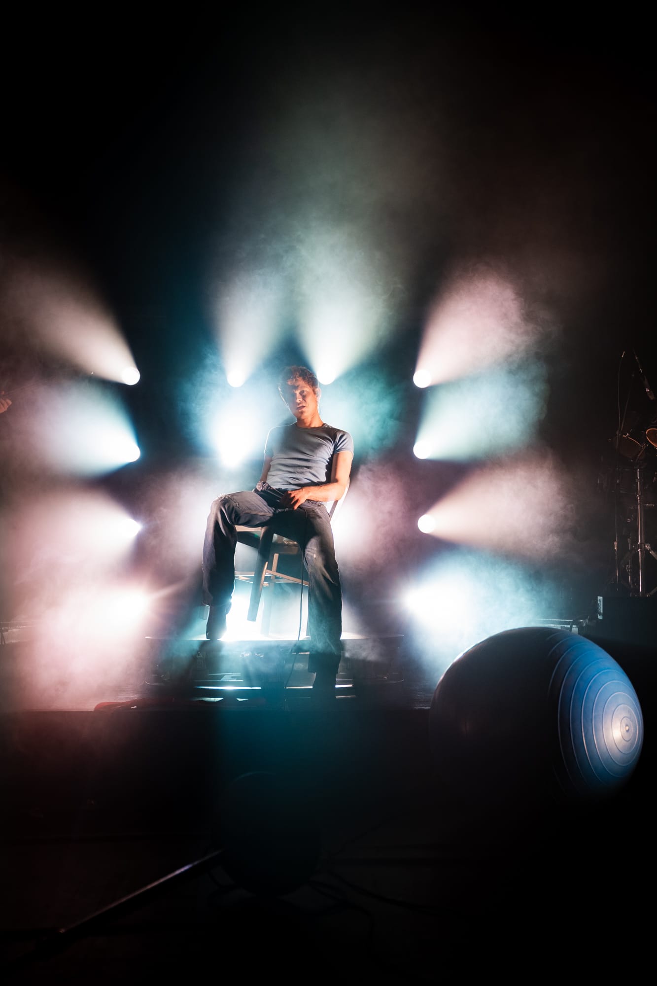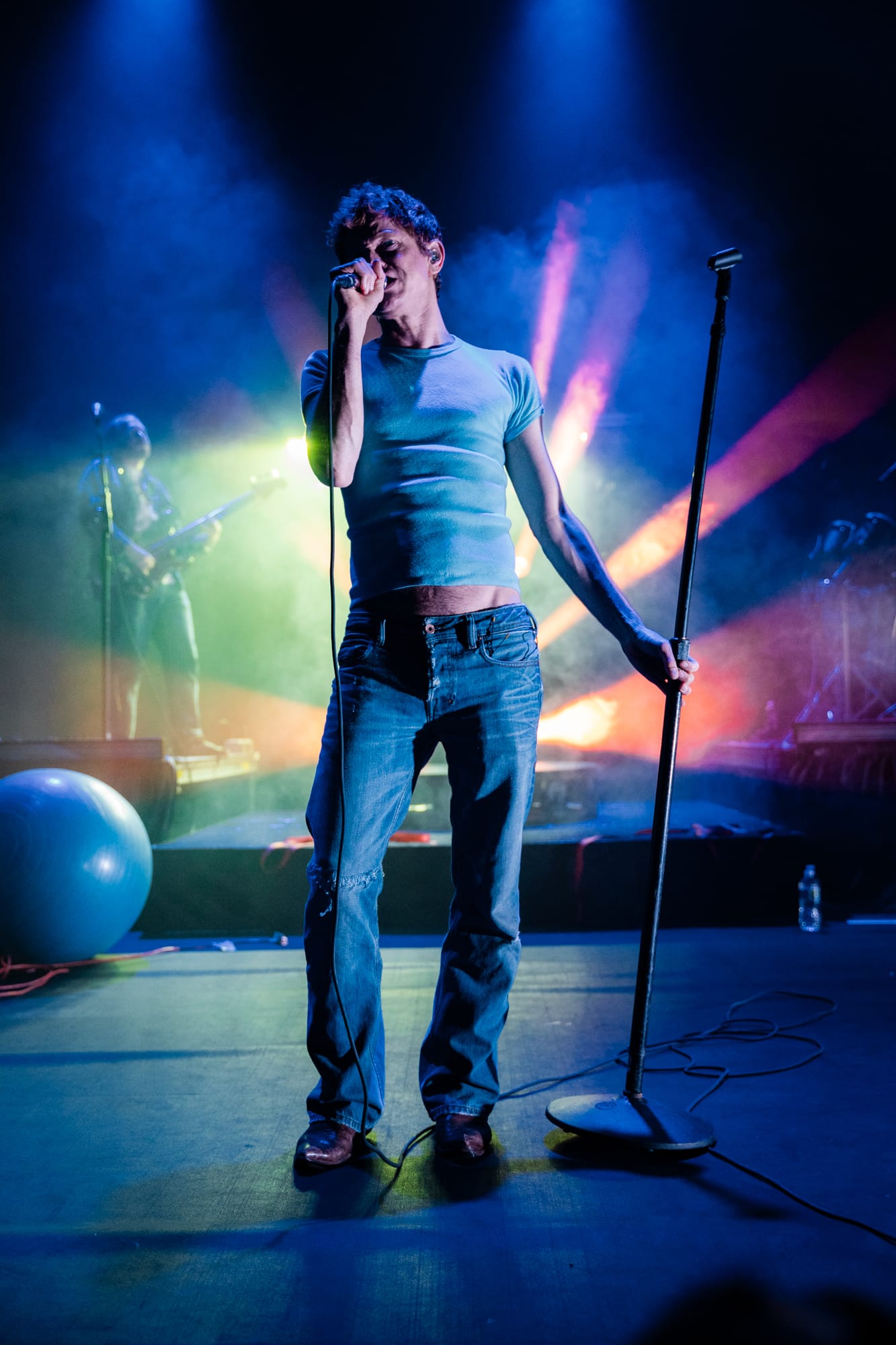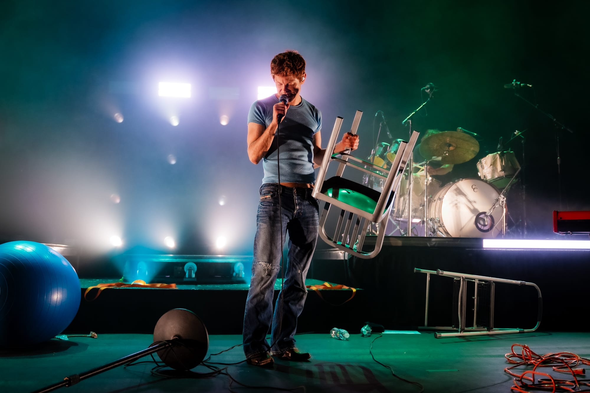 Prior to Perfume Genius taking the stage, it looked like a production hand had used the space to unpack a bunch of gear and the promptly forgotten to come back and clean up the mess. The stage contained randomly placed objects, including an aluminum chair, an exercise ball, and what looked to be about half a dozen extension cords. Calling back to the Glory album cover even more was Hadreas himself, wearing a slightly different too-small t-shirt and what looked to be the exact same jeans. And while he stood in one place during his performance of the night's opener 'In A Row', it was one of the only times throughout the night he would remain stationary.