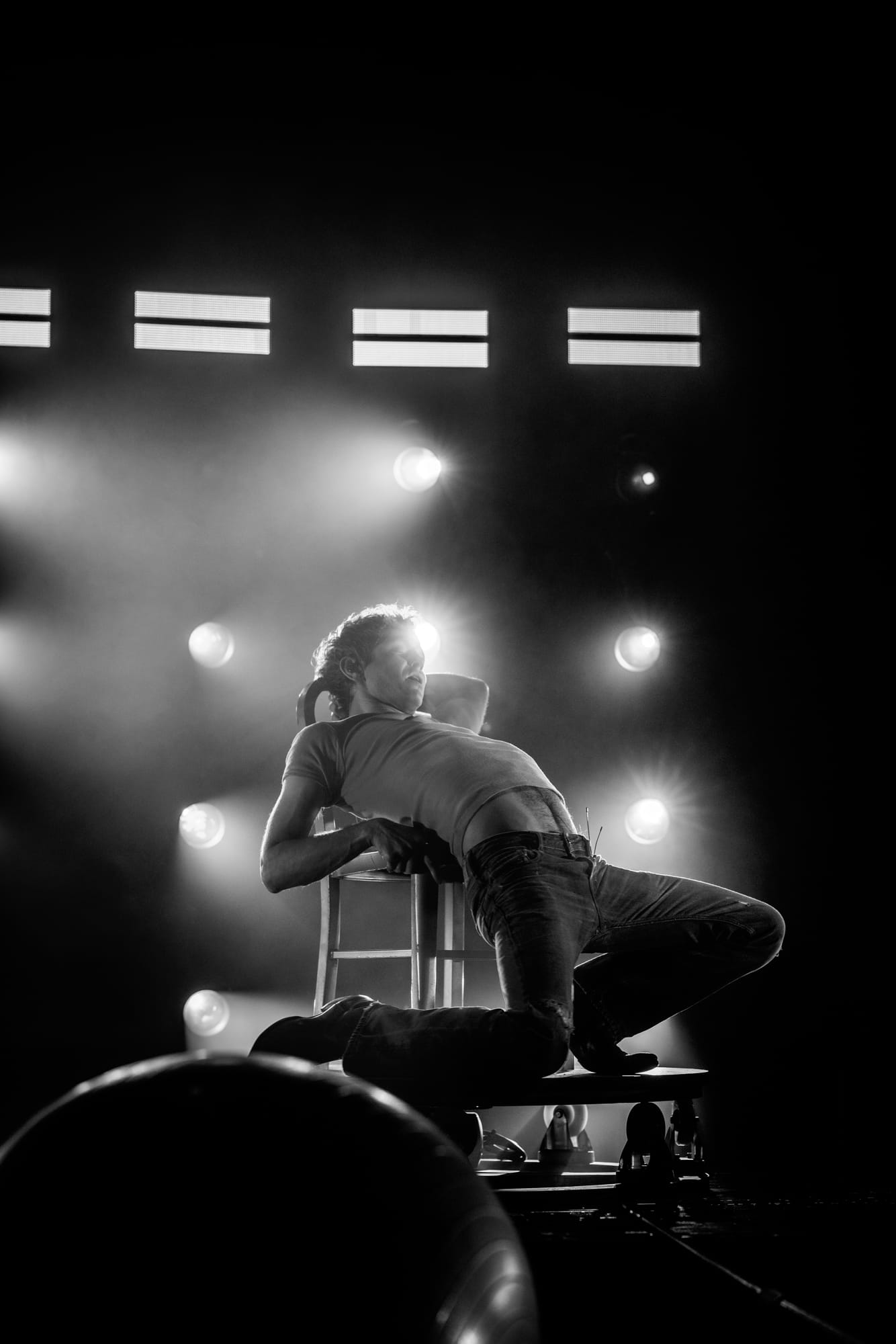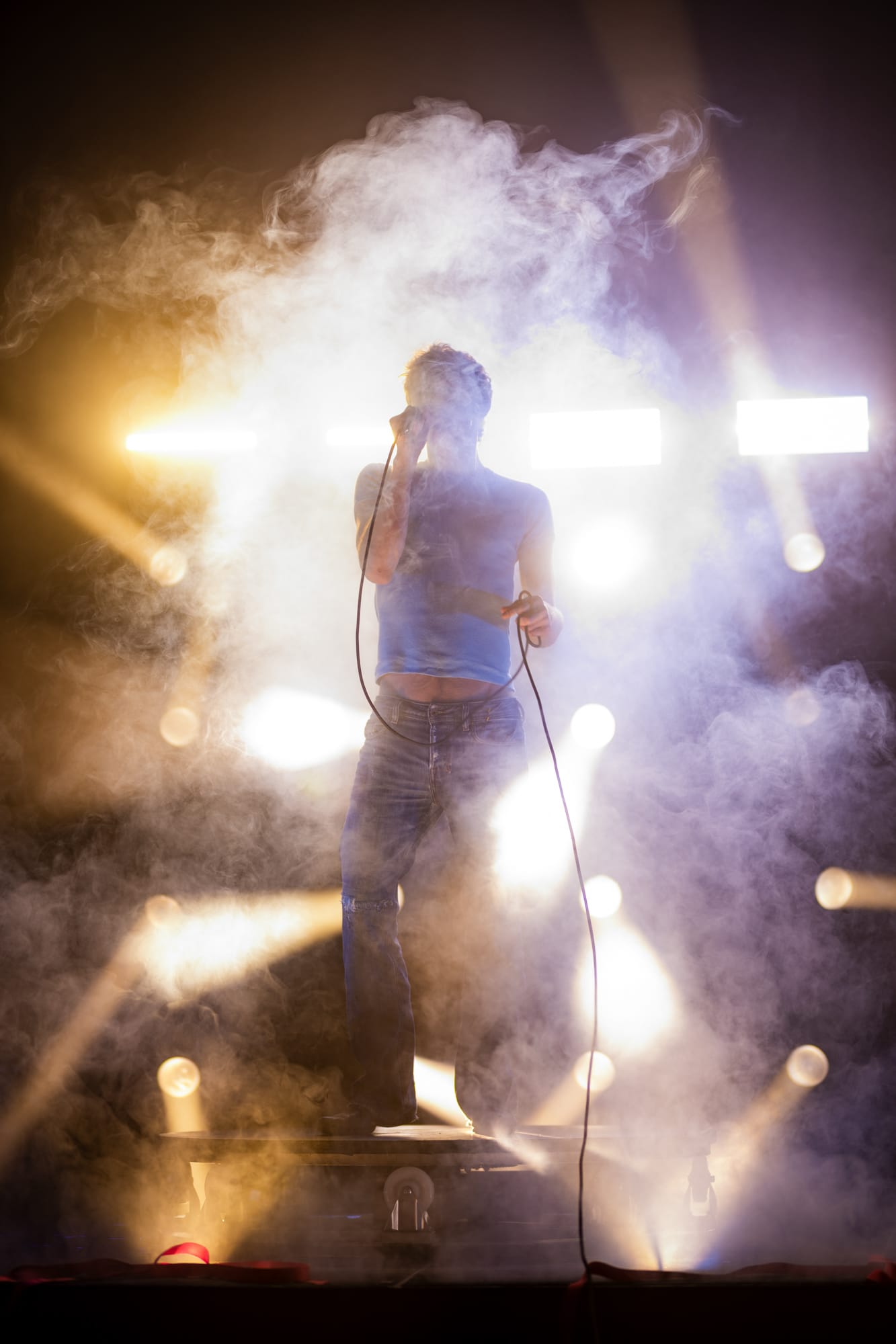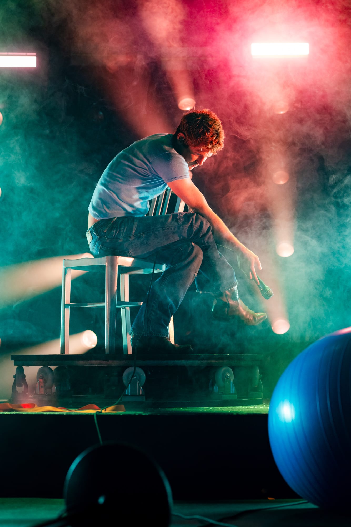 Prior to Perfume Genius taking the stage, it looked like a production hand had used the space to unpack a bunch of gear and the promptly forgotten to come back and clean up the mess. The stage contained randomly placed objects, including an aluminum chair, an exercise ball, and what looked to be about half a dozen extension cords. Calling back to the Glory album cover even more was Hadreas himself, wearing a slightly different too-small t-shirt and what looked to be the exact same jeans. And while he stood in one place during his performance of the night's opener 'In A Row', it was one of the only times throughout the night he would remain stationary.