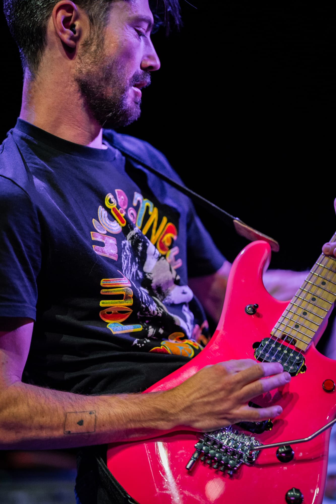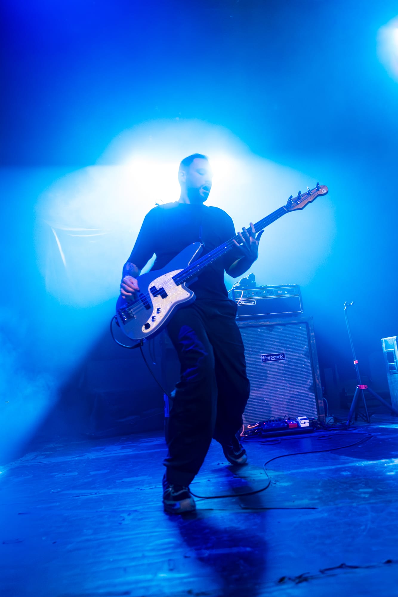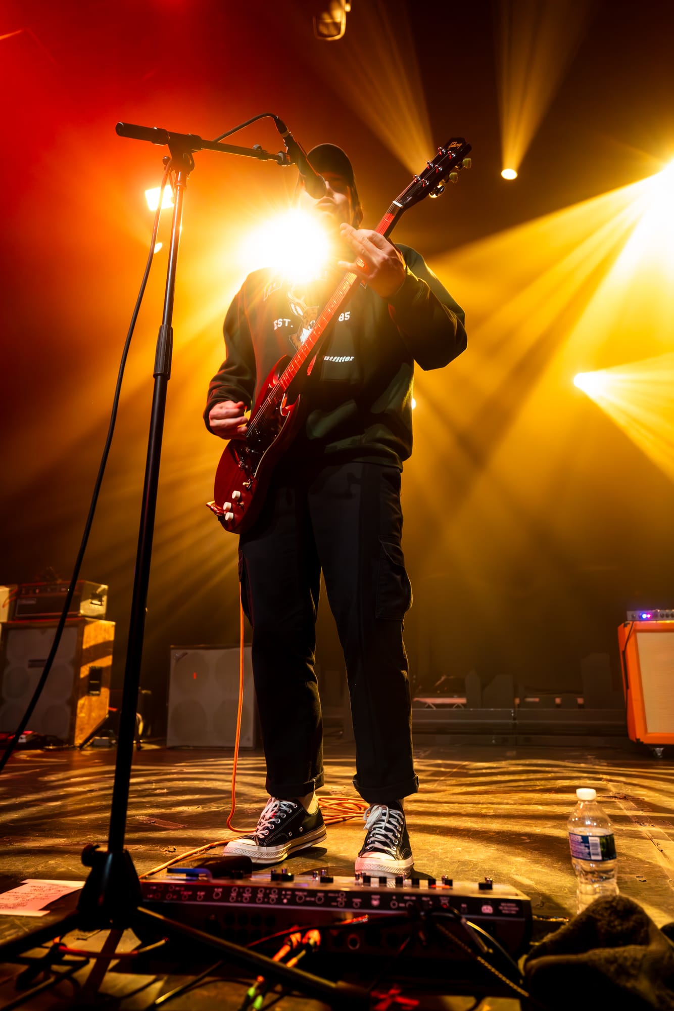 Tearing through exactly half of My Apologies to the Chef (which will absolutely be appearing here again in the next week or so as I name my favorite albums of 2025), it's almost impossible to take your eyes off lead singer Coco Kinnon as she stomps, body slams, spins, jumps, shreds on guitar, and is essentially a one-woman musical tornado from beginning to end of the set. And while she rightfully gets a lot of the focus, these songs wouldn't punch nearly as hard as they do (and they really do) without Dan Fuson's guitar mastery. How much of his ability to rip through insane crunchy riffs like it's no big deal whatsoever is derived from his hot pink guitar? I don't know, and to be honest with you, why even take the chance to find out? That's like telling Picasso to switch brushes mid-painting or asking Jesus to switch to a different non-pink guitar. And when he's not busy balancing a bass above his head on one hand MID SONG, bassist Austin Luther low-key ties every single song together with his bass playing (which is quite a feat considering most Winona Fighter songs feel like slam dancing in the middle of a hurricane so keeping them pulled together and moving in one direction sounds near-impossible).